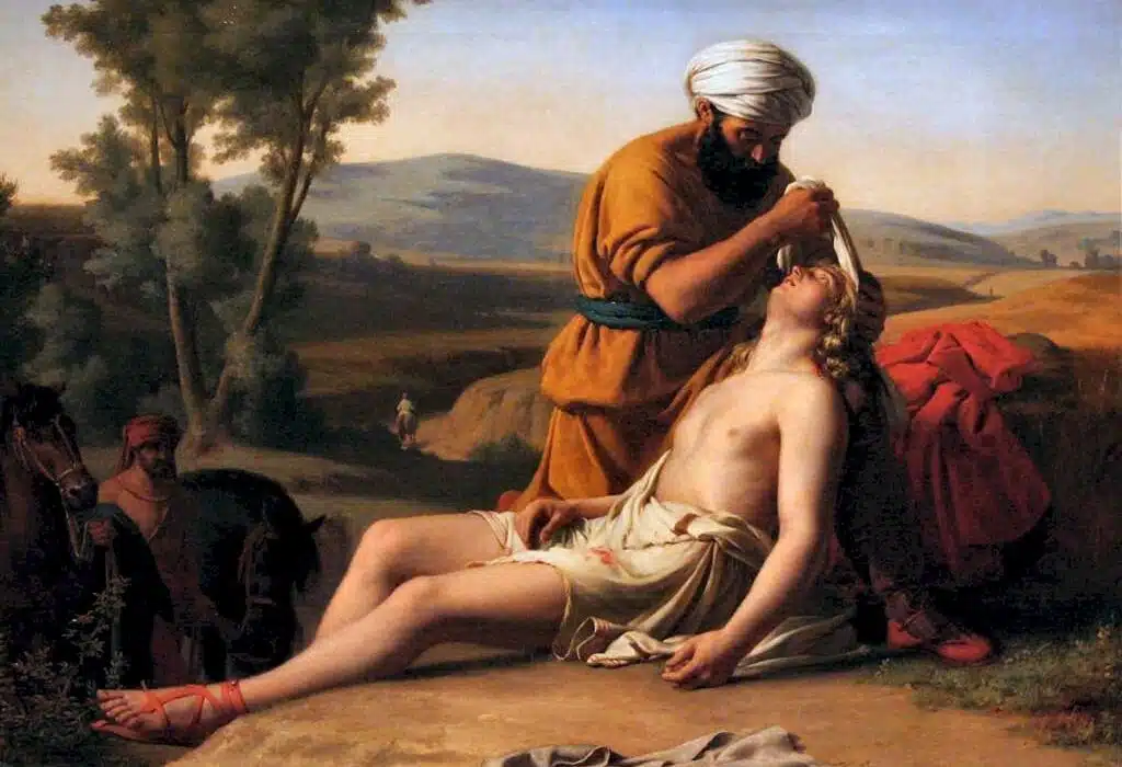 Mais le juriste n’en reste pas là et demande : « Qui est mon prochain ? » Jésus raconte alors l’histoire d’un homme que des brigands ont laissé à moitié mort sur la route reliant Jérusalem à Jéricho. Un lévite et un prêtre passent par là mais n’ont pas un geste pour le blessé alors qu’un Samaritain, qui emprunte la même route, prend soin de la victime. Ce n’est pas Jésus qui conclut cette histoire puisqu’il retourne sa question à l’homme de loi : « Lequel des trois s’est montré le prochain de l’homme qui était tombé sur les bandits ? » Le juriste est bien obligé de reconnaître que c’est le Samaritain qui s’est montré le prochain de l’homme blessé.
